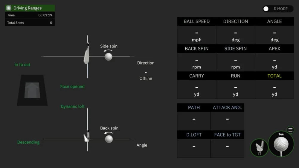 - Driving Range – Full swing practice with detailed shot feedback